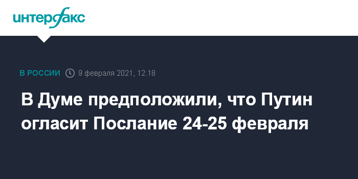 Он также обратил внимание, что на этой неделе - 24 и 25 февраля - Госдума отменила пленарные заседания, перенеся их на 18 февраля. "Возможно, в эти даты и состоится послание", - предположил собеседник "Интерфакса".