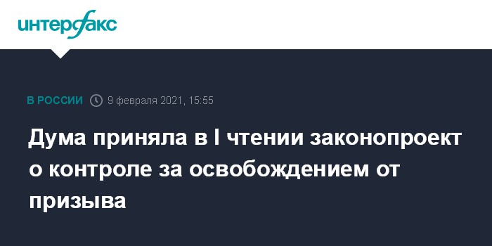 Москва. 9 февраля. INTERFAX.RU - Госдума во вторник приняла в первом чтении правительственный проект закона о контроле за порядком предоставления отсрочек и освобождения от призыва на военную службу по состоянию здоровья.