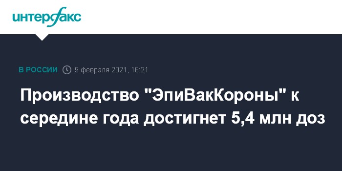 Москва. 9 февраля. INTERFAX.RU - К концу июня в России, по предварительным оценкам, будет произведено 5,4 млн доз вакцины от коронавируса "ЭпиВакКорона", разработанной научным центром "Вектор" Роспотребнадзора, сообщил "Интерфаксу" министр промышленности и торговли Денис Мантуров.