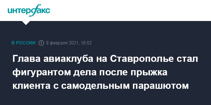 Москва. 9 февраля. INTERFAX.RU - Уголовное дело возбуждено против президента общественной организации Ставропольского края "Авиационный спортивный клуб", клиент которого получил травму во время прыжка с самодельным парашютом, сообщается на сайте московского межрегионального следственного управления на транспорте СК РФ.