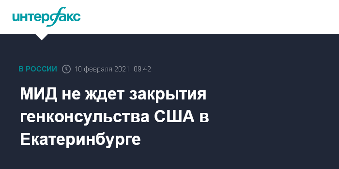 Москва. 10 февраля. INTERFAX.RU - В МИД России не поступало документов о возможном закрытии генконсульства США в Екатеринбурге, сообщил на пресс-конференции представитель министерства в этом городе Александр Харлов.