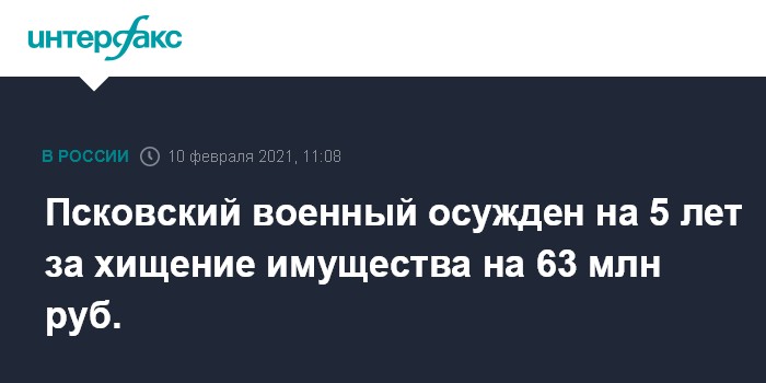 Псковский военный осужден на 5 лет за хищение имущества на 63 млн руб.