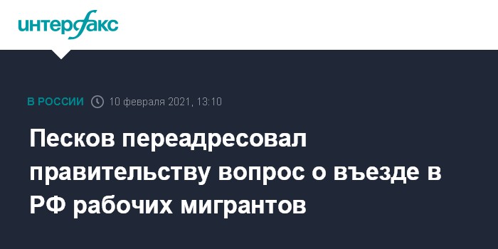 Москва. 10 февраля. INTERFAX.RU - Пресс-секретарь президента РФ Дмитрий Песков переадресовал в правительство вопрос о допуске в Россию рабочих мигрантов, отметив, что кабинет министров активно обсуждает эту тему.