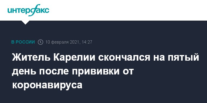 Москва. 10 февраля. INTERFAX.RU - Житель города Кеми (Карелия) умер на пятые сутки после прививки от коронавируса; в министерстве здравоохранения республики не связывают летальный исход с действием вакцины "Спутник V".