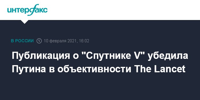 Москва. 10 февраля. INTERFAX.RU - Публикация в медицинском журнале The Lancet об эффективности российской вакцины против коронавируса "Спутник V" подтверждает высокий статус и объективность этого издания, заявил на совещании с министрами президент Владимир Путин.