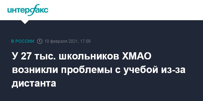 Москва. 10 февраля. INTERFAX.RU - Около 20% школьников 6-11 классов Ханты-Мансийского автономного округа - Югры (порядка 27 тыс. учащихся) испытали трудности при учебе во второй четверти из-за дистанционного обучения, сообщил директор департамента образования и молодежной политики округа Алексей Дренин.