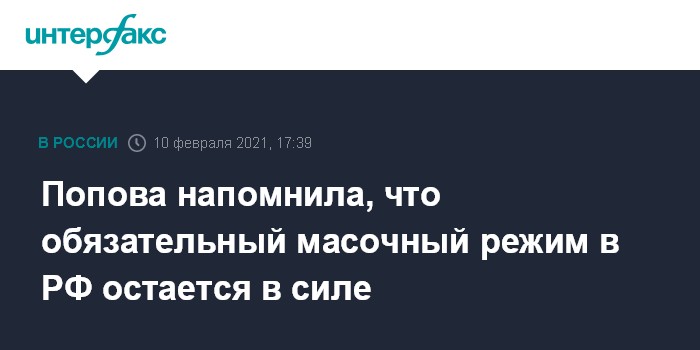 Москва. 10 февраля. INTERFAX.RU - В России пока не будут отменять обязательный масочный режим, заявила глава Роспотребнадзора Анна Попова.