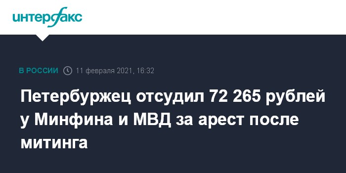 Москва. 11 февраля. INTERFAX.RU - Александр Гусаров из Петербурга отсудил у Минфина России и МВД в общей сложности 72 265 рублей за неправомерное задержание после митинга 9 сентября 2018 года и административный арест, сообщила пресс-служба городских судов.