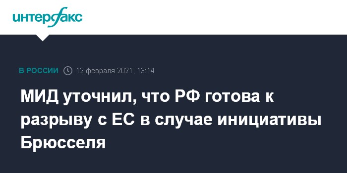 Ранее в пятницу глава МИД РФ Сергей Лавров в эфире программы "Соловьев-лайф", отвечая на вопрос о том, идет ли Россия к разрыву с ЕС, сказал: "Мы исходим из того, что мы готовы".