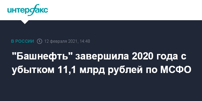 Москва. 12 февраля. INTERFAX.RU - Убыток "Башнефти" по МСФО за 2020г составил 11,1 млрд рублей против прибыли в 76,59 млрд рублей годом ранее, говорится в отчете компании.