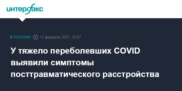 Москва. 12 февраля. INTERFAX.RU - Треть пациентов, тяжело перенесших коронавирус, испытывают посттравматическое стрессовое расстройство, сообщила старший преподаватель кафедры медицинской психологии и психофизиологии СПбГУ Инга Короткова со ссылкой на данные исследований.