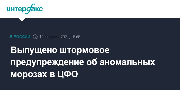 Москва. 12 февраля. INTERFAX.RU - Гидрометцентр России выпустил штормовое предупреждение об аномально холодной погоде в Центральном федеральном округе, сообщив, что вслед за снегопадами и метелями в центре Европейской России будут усиливаться морозы.