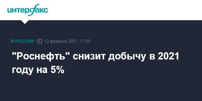 Москва. 12 февраля. INTERFAX.RU - В 2021 году добыча нефти "Роснефтью" с учетом продаж хвостовых активов будет ниже на 5% по сравнению с 2020 годом, сообщил вице-президент компании по внутреннему сервису Эрик Лирон на телеконференции после публикации годового отчета по МСФО.