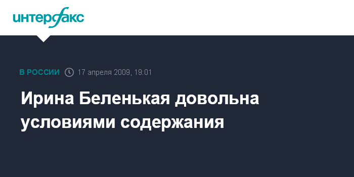 "По словам Ирины Беленькой, с которой сегодня в течение двух часов общался наш консул, условия ее содержания абсолютно удовлетворительные, относятся к ней корректно, претензий она ни к чему не имеет, жалоб и дополнительных просьб не высказывала ", - сказала Звонова.