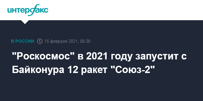 Москва. 15 февраля. INTERFAX.RU - Со стартовой площадки №31 космодрома Байконур в 2021 году будет проведено 12 пусков ракет "Союз-2", сообщил глава Центра эксплуатации объектов наземной космической инфраструктуры Руслан Мухамеджанов.