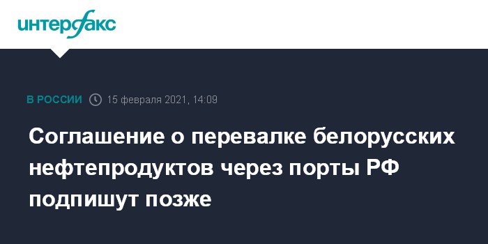 Москва. 15 февраля. INTERFAX.RU - Минтранс Белоруссии подтвердил, что готов подписать с российскими коллегами соглашение об организации перевалки белорусских нефтепродуктов в российских портах, но предложил перенести эту процедуру, поскольку не успевает все подготовить. Ранее сообщалось, что соглашение подпишут 15 февраля.