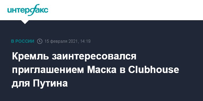 Москва. 15 февраля. INTERFAX.RU - В Кремле посчитали интересным предложение бизнесмена Илона Маска президенту РФ Владимиру Путину пообщаться в социальной сети Clubhouse, заявил пресс-секретарь президента РФ Дмитрий Песков.