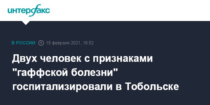 Москва. 15 февраля. INTERFAX.RU - В больницу Тобольска (Тюменская область) госпитализировали двух человек с симптомами "гаффской болезни". Об этом сообщили "Интерфаксу" в понедельник в пресс-службе регионального департамента здравоохранения.