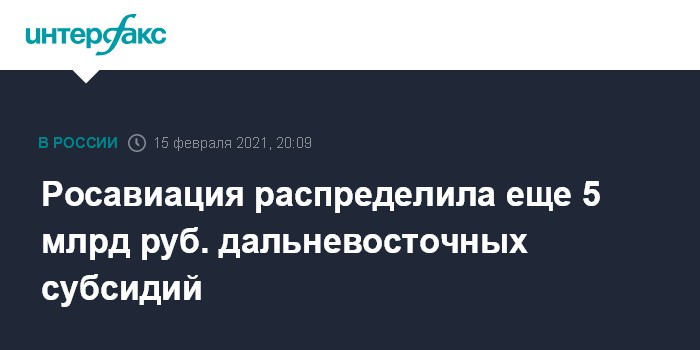 Москва. 15 февраля. INTERFAX.RU - Росавиация распределила 5 млрд руб. дополнительных субсидий, выделенных правительством на перелеты жителей Дальнего Востока в центральную часть РФ.
