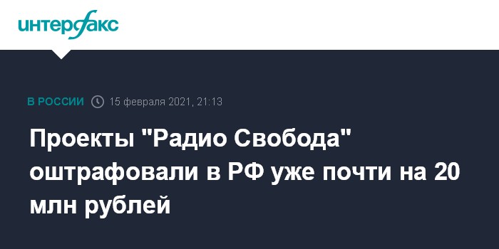 Москва. 15 февраля. INTERFAX.RU - Сумма штрафов в отношении проектов медиакорпорации "Радио Свободная Европа/Радио Свобода" (признана в России СМИ-иноагентом) и гендиректора созданного в РФ ООО Андрея Шарого достигла 19,3 млн рублей, сообщили "Интерфаксу" в пресс-службе Роскомнадзора.
