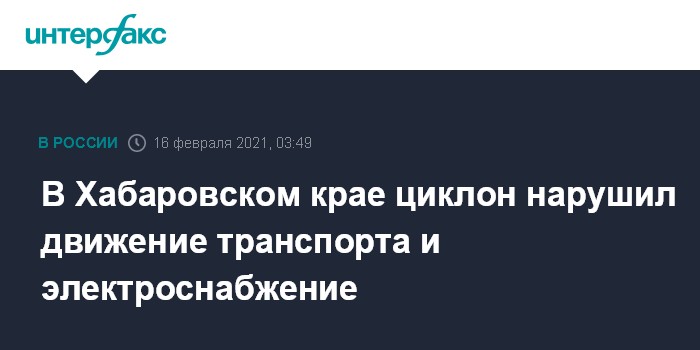 Москва. 16 февраля. INTERFAX.RU - Снежный циклон, который действует на территории Хабаровского края, привел к нарушению транспортного сообщения в регионе и отключению электроэнергии в ряде населенных пунктов, сообщает пресс-служба краевого ГУ МЧС.