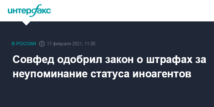 Москва. 17 февраля. INTERFAX.RU - Совет Федерации одобрил закон о введении штрафов за распространение информации об иностранных агентах и их материалов без указания их статуса.