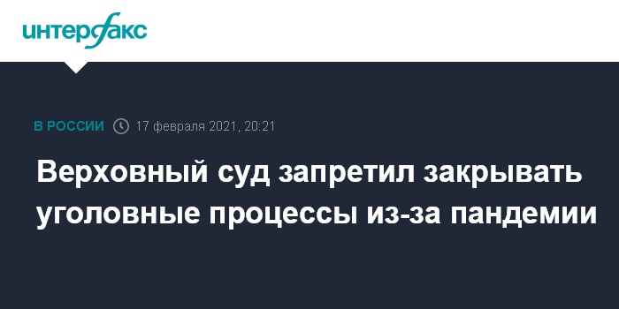 Москва. 17 февраля. INTERFAX.RU - Суды не вправе закрывать слушания по уголовным делам, ссылаясь на необходимость обезопасить здоровье участников процесса в условиях действия ограничений в связи с новой коронавирусной инфекцией. Верховный суд указал это в обзоре судебной практики в условиях пандемии COVID-19.