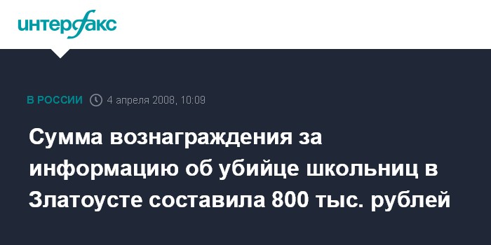 Кроме этого, о выплате вознаграждения за информацию о преступнике объявили мэр Златоуста в размере 100 тыс. рублей и Златоустовская оружейная компания в размере 200 тыс. рублей.
