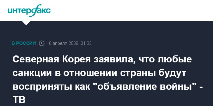 Вашингтон. 18 апреля. ИНТЕРФАКС - Пхеньян заявил в субботу, что любое давление или санкции в отношении страны со стороны международного сообщества будет рассмотрено в КНДР как "объявление войны", сообщает американская телекомпания Си-Эн-Эн со ссылкой на официальные северокорейские СМИ.