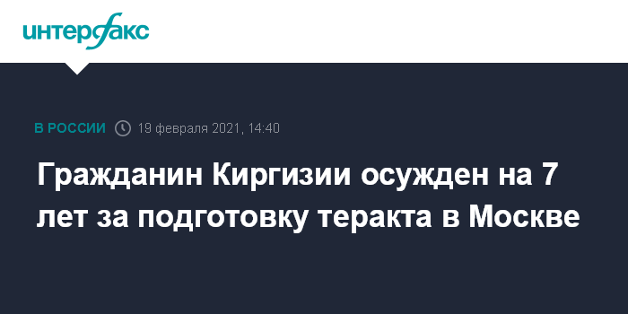 Москва. 19 февраля. INTERFAX.RU - Военный суд приговорил к семи годам лишения свободы гражданина Киргизии, готовившего теракт в Москве и пропагандировавшего идеи терроризма в интернете, сообщает в пятницу прокуратура столицы.