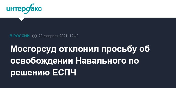 Москва. 20 февраля. INTERFAX.RU - Мосгорсуд отказался удовлетворить ходатайство защитников оппозиционера Алексея Навального о его освобождении на основании решения Европейского суда по правам человека (ЕСПЧ).