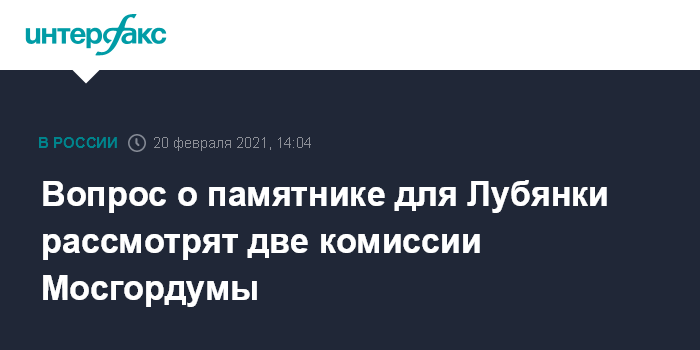 Москва. 20 февраля. INTERFAX.RU - Вопрос об установке памятника на Лубянской площади расссмотрят комиссии Мосгордумы по культуре и по монументальному искусству, сообщил "Интерфаксу" председатель комиссии по культуре и массовым коммуникациям Евгений Герасимов.