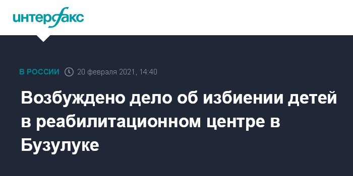 Москва. 20 февраля. INTERFAX.RU - В Оренбургской области возбуждено уголовное дело об избиении воспитанников в социально-реабилитационном центре "Радуга" в Бузулуке, сообщили в СК. Дело расследуется по статьям 156 УК (неисполнение обязанностей по воспитанию несовершеннолетнего), ч. 1 ст. 293 УК(халатность).