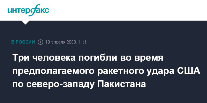 Лондон. 19 апреля. INTERFAX.RU - Три человека погибли, еще пятеро были ранены в результате ракетного удара, нанесенного с беспилотного летательного аппарата по боевикам в регионе Южный Вазаристан на северо-западе Пакистана, сообщает в воскресенье британская телерадиокорпорация Би-би-си со ссылкой на заявление местных правоохранительных органов.