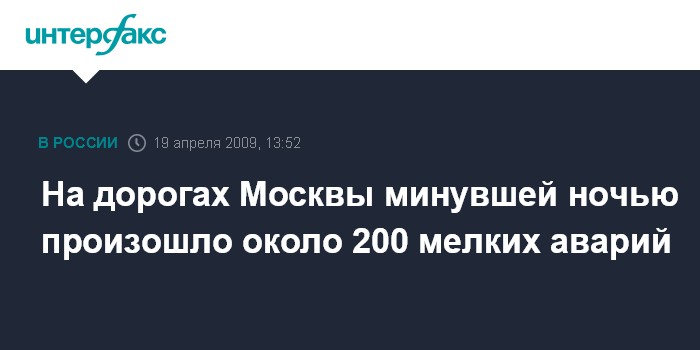 Москва. 19 апреля. INTERFAX.RU - В Москве в ночь с субботы на воскресенье произошло небольшое увеличение числа мелких аварий по сравнению с другими днями, однако рост числа ДТП был вызван не плохой работой столичных служб в сложных погодных условиях, а возросшей интенсивностью движения, заявляют в ГИБДД Москвы.