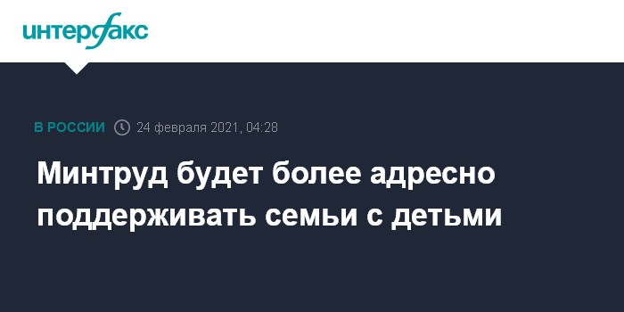 Москва. 24 февраля. INTERFAX.RU - Министерство труда и социальной защиты РФ (Минтруд) сейчас занимается проработкой мер, направленных на усиление адресной поддержки семей с детьми, заявил заместитель председателя комитета Совета Федерации по социальной политике Валерий Рязанский.