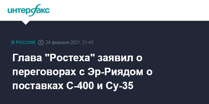 Москва. 24 февраля. INTERFAX.RU - Москва и Эр-Рияд обсуждают поставки систем С-400 и истребителей Су-35, сообщил глава "Ростеха" Сергей Чемезов.