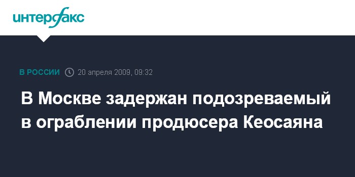 Москва. 20 апреля. INTERFAX.RU - Сотрудники уголовного розыска задержали в пятницу вечером на западе столицы жителя города, которого подозревают в ограблении продюсера Давида Кеосаяна, сообщил "Интерфаксу" источник в правоохранительных органах города.