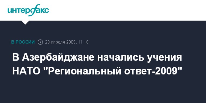 Баку. 20 апреля. ИНТЕРФАКС-АВН - Старт международным военным учениям "Региональный ответ-2009" в рамках "Партнерства ради мира" дан в субботу в Азербайджане, говорится в сообщении пресс-службы министерства обороны республики.