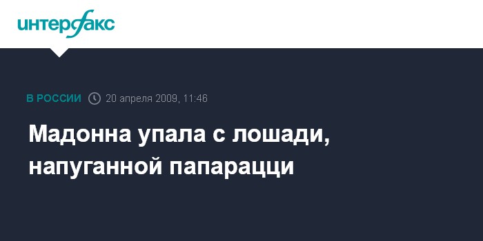 Москва. 20 апреля. INTERFAX.RU - Популярная американская певица Мадонна в субботу вечером получила ушибы и легкие травмы во время катания на лошади в Хэмптносе, в Нью-Йорке, сообщается на веб-сайте журнала "Пипл" со ссылкой на заявление представителя певицы Лиз Розенберг.