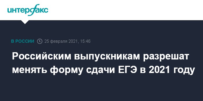 Москва. 25 февраля. INTERFAX.RU - В 2021 году участникам единого государственного экзамена (ЕГЭ) и государственного выпускного экзамена (ГВЭ) после 11 класса разрешат изменить форму сдачи экзамена и перечень ранее выбранных предметов, говорится в проекте совместного приказа Минпросвещения и Рособрнадзора.