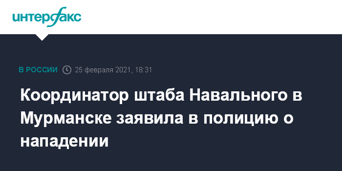 Москва. 25 февраля. INTERFAX.RU - Координатор мурманского штаба оппозиционера Алексея Навального Виолетта Грудина в четверг обратилась в полицию Мурманска с заявлением о нападении и угрозах в свой адрес.