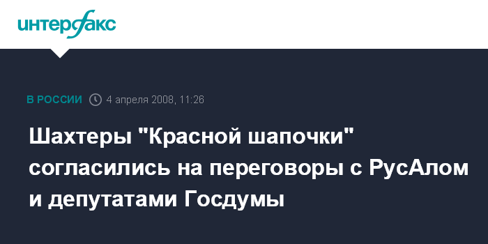 Москва. 4 апреля. INTERFAX.RU - Горняки шахты "Красная шапочка" ОАО "Севуралбокситруда" (СУБР, входит в состав "Объединенной компании "Российский алюминий") согласились на переговоры с представителями ОК "РусАл" и депутатами Госдумы и вышли на поверхность, сообщил вице-спикер Госдумы Валерий Язев журналистам в пятницу.
