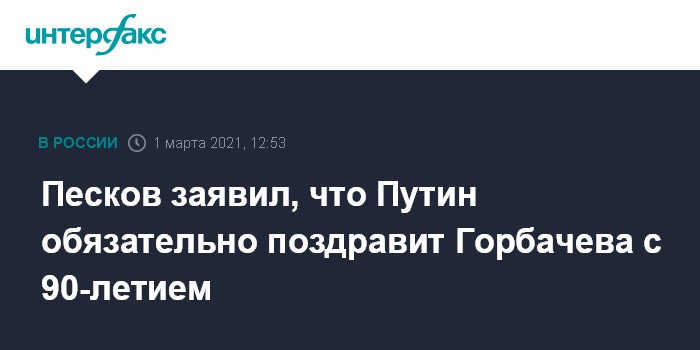 "Я не сомневаюсь, что президент поздравит Михаила Сергеевича, пожелает ему здоровья. Как это будет, мы сообщим своевременно", - сказал пресс-секретарь Путина Дмитрий Песков в понедельник, отвечая на вопрос журналистов.