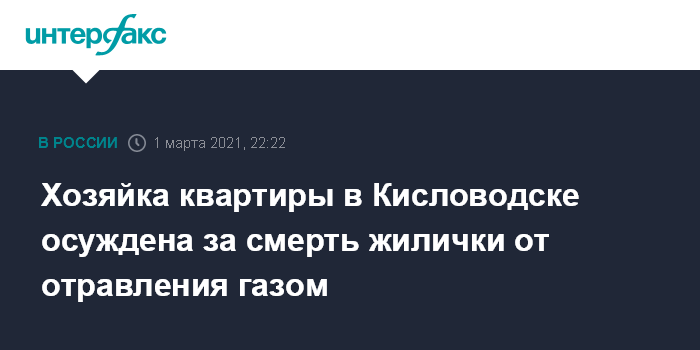 Москва. 1 марта. INTERFAX.RU - Жительница Кисловодска Гузель Кильдибекова приговорена к году ограничения свободы за то, что в октябре 2019 года девушка, снявшая у нее квартиру, отравилась газом и умерла. Суд установил, что она сдала квартиру с неисправным газовым оборудованием, сообщили в управлении СК по Ставрополью.