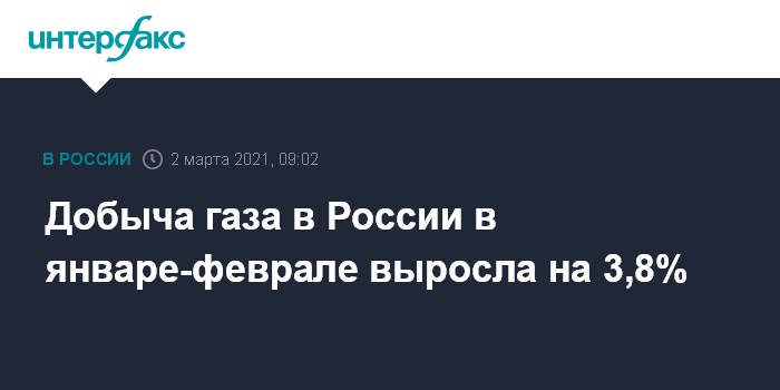Москва. 2 марта. INTERFAX.RU - В России в первые два месяца 2021 года объем добычи газа увеличился на 3,8% в годовом измерении составил 130,66 млрд кубометров, говорится в оперативной сводке ЦДУ ТЭК. Поправка на високосный год учтена.