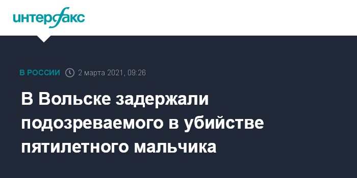 Москва. 2 марта. INTERFAX.RU - В Вольске ранним утром в понедельник на улице нашли насмерть замерзшего пятилетнего мальчика. На следующий день в СК Саратовской области сообщили, что задержан подозреваемый в убийстве - это 38-летний гражданский муж матери ребенка.