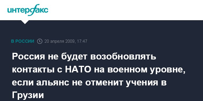 Москва. 20 апреля. INTERFAX.RU - Россия не будет принимать участия во встрече с НАТО на уровне начальников Генштабов, если альянс не отменит учения в Грузии.