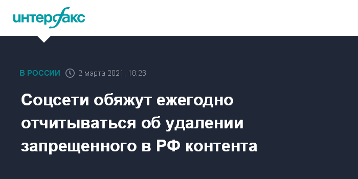Москва. 2 марта. INTERFAX.RU - Социальные сети в рамках закона о "самоочищении" от запрещенного в России контента должны будут не позднее 1 февраля каждого года публиковать отчеты о проделанной ими работе, а также разместить на главной странице электронную форму для жалоб пользователей, следует из проектов приказов Роскомнадзора (РКН).