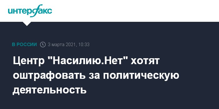 Москва. 3 марта. INTERFAX.RU - Признанный иноагентом центр помощи жертвам домашнего насилия "Насилию.Нет" могут оштрафовать, поскольку эксперт Минюста счел, что организация нарушает законы об иногентах и занимается политической деятельностью. Политику в ведомстве усмотрели в призывах центра поддержать законопроект о профилактике домашнего насилия, пишет "Коммерсантъ".